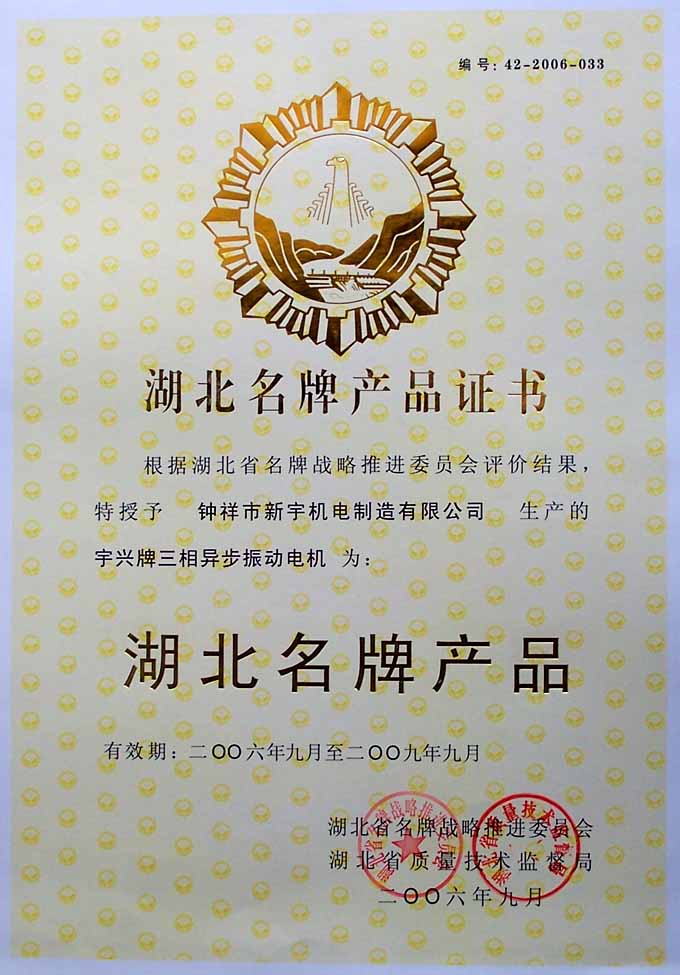 湖北名牌產品證書